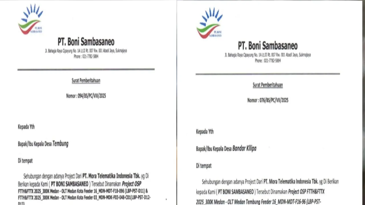 Beberapa waktu kemudian, pengawas A.P. mengirimkan dokumen melalui pesan WhatsApp kepada tim media berupa Surat Pemberitahuan pekerjaan yang ditujukan kepada Pemerintah Desa Bandar Klippa dan Desa Tembung, Kecamatan Percut Sei Tuan. Surat tersebut diketahui telah ditandatangani oleh masing-masing kepala desa.